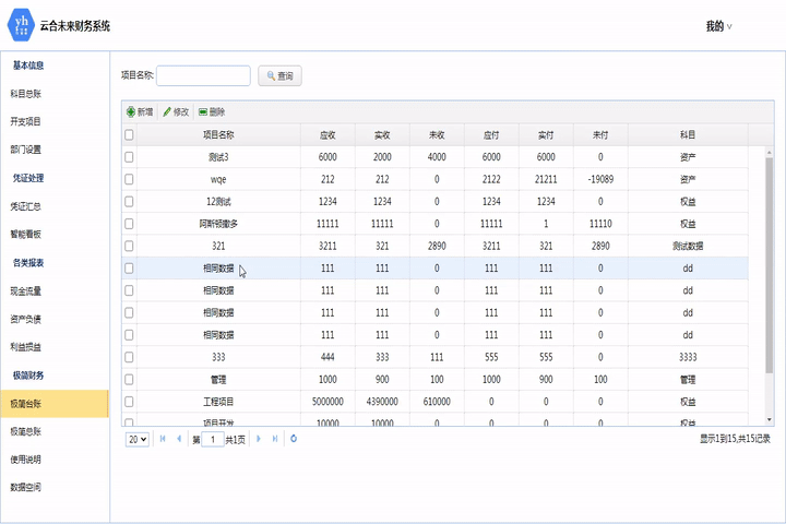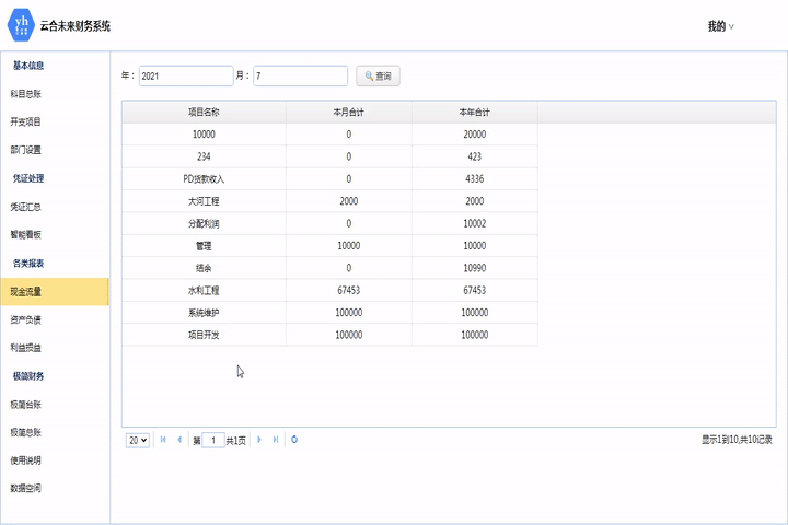 此模塊匯總所有開支項目對應的憑證金額,貸為收入,借為支出。可按時間查詢。