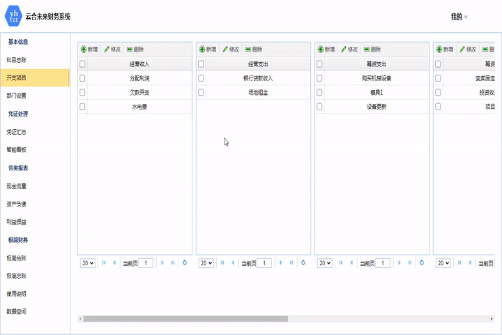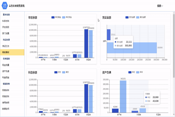 財務管理系統是我公司開發的一套成熟、穩定、簡單、易用的綜合財務管理軟件,實現了自主管理財務的科目信息、開支項目。匯總年初余額,年末余額。包括各財情況報表、利益損益、現金流量等。其中智能看板模塊把數據圖表化,且圖表簡潔大方,可以讓用戶對財務情況一目了然。